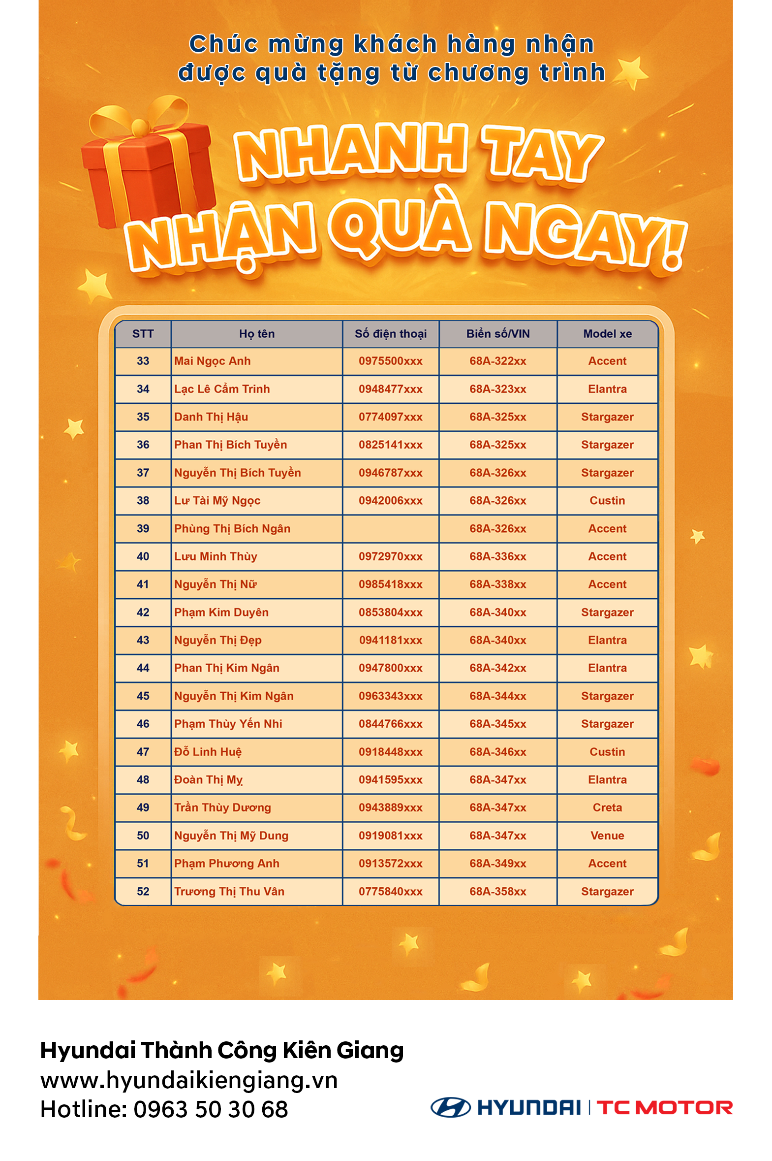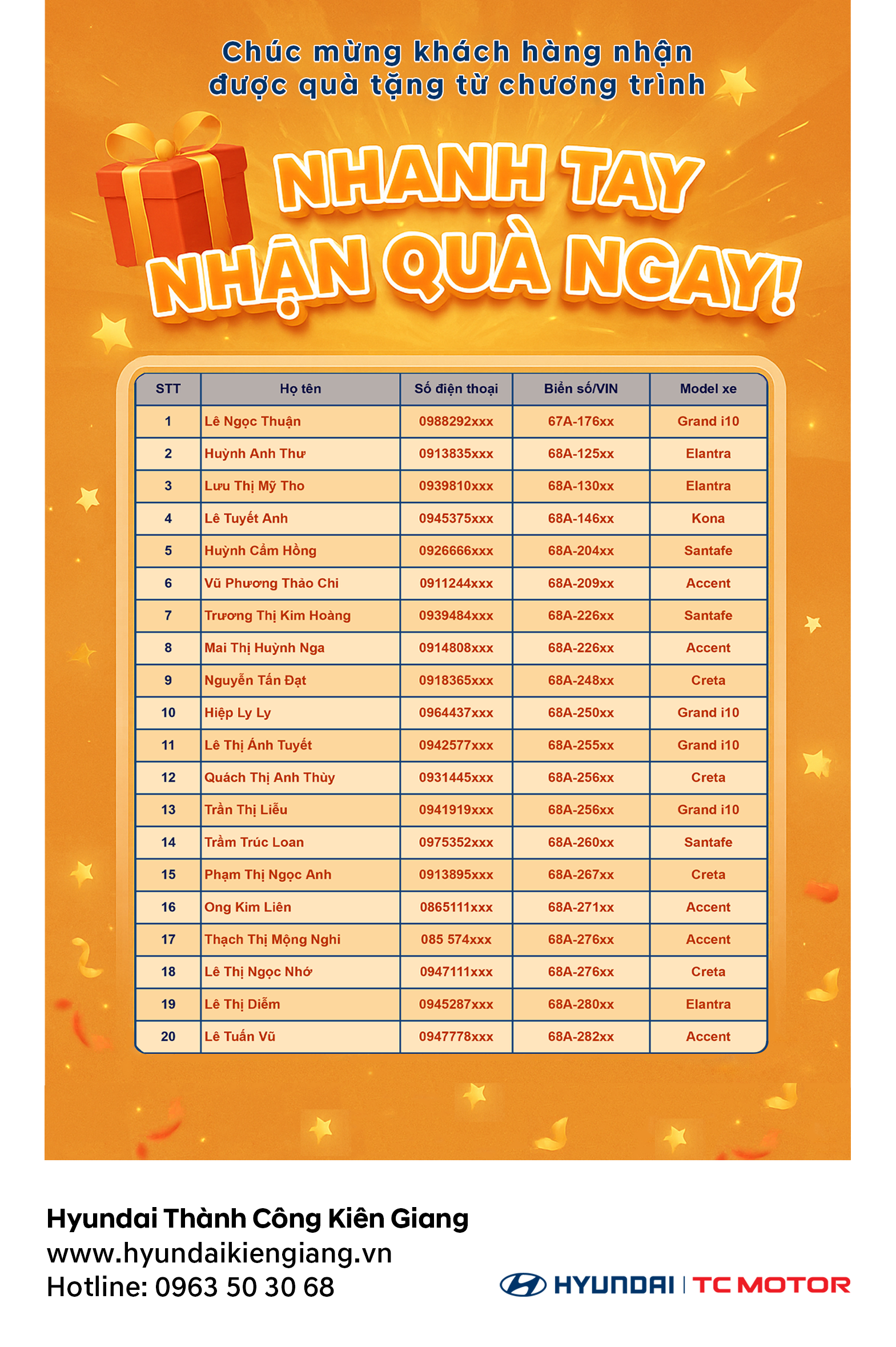Dưới đây là danh sách khách hàng may mắn nhận được quà tặng từ chương trình: