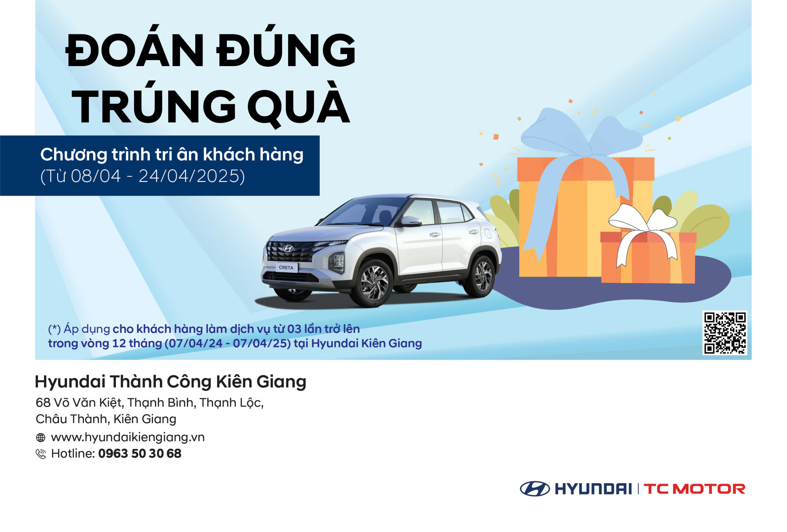 Nhằm tri ân khách hàng đã tin tưởng đồng hành cùng Hyundai Kiên Giang trong suốt thời gian qua. Hyundai Kiên Giang xin gửi đến Quý Khách hàng một phần quà đặc biệt thông qua chương trình “Đoán đúng – Trúng quà”, như một lời cảm ơn chân thành nhất.