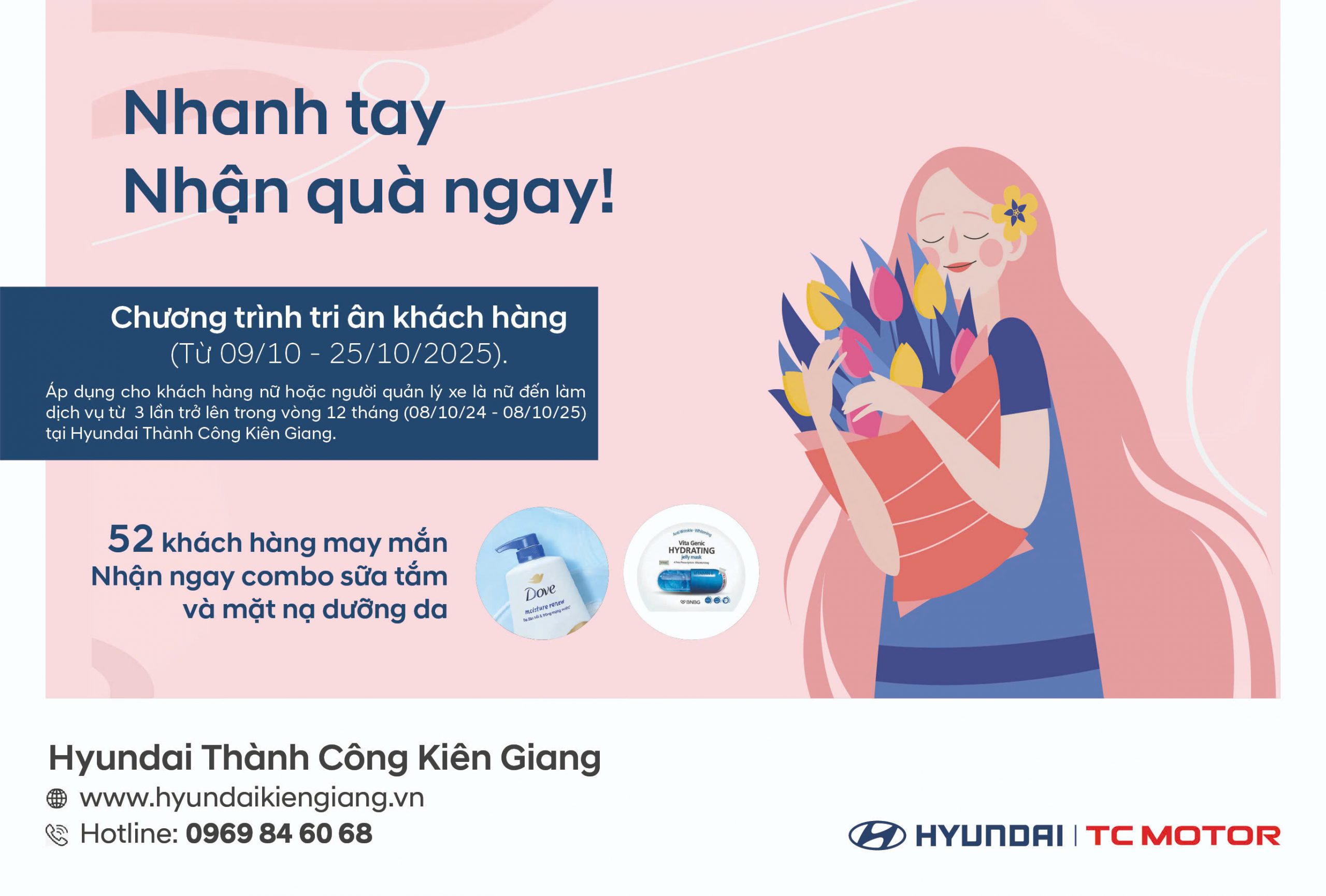 Nội dung và Thể lệ: Khách hàng là nữ hoặc quản lý xe là nữ nhận được cuộc gọi cảm ơn từ Đại lý Hyundai Thành Công Kiên Giang sẽ nhận được quà tặng.