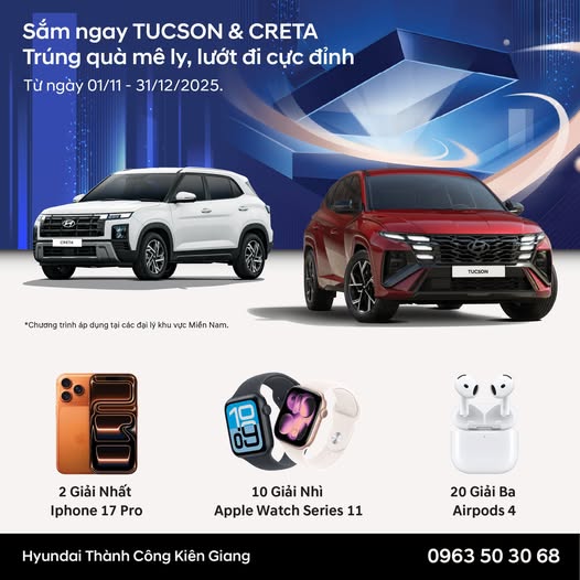 Với mong muốn mang đến cho khách hàng khu vực miền Nam niềm vui trọn vẹn cùng những trải nghiệm giá trị, Hyundai Thành Công chính thức triển khai chương trình khuyến mại bán hàng “Sắm ngay Tucson & Creta – Trúng quà mê ly, lướt đi cực đỉnh”, diễn ra từ ngày 01/11 đến hết ngày 31/12/2025.