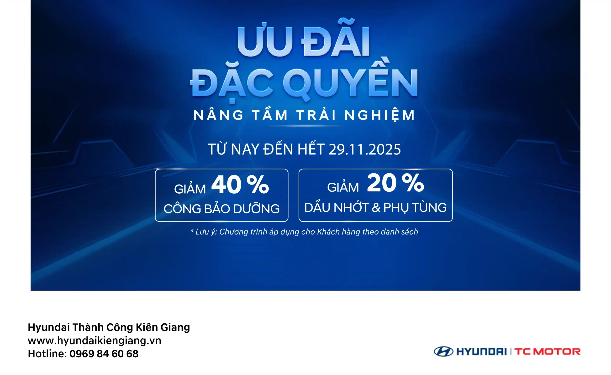 Từ nay đến ngày 29/11, Hyundai Kiên Giang triển khai chương trình Ưu Đãi Đặc Quyền – Nâng Tầm Trải Nghiệm dành cho khách hàng sử dụng dịch vụ: